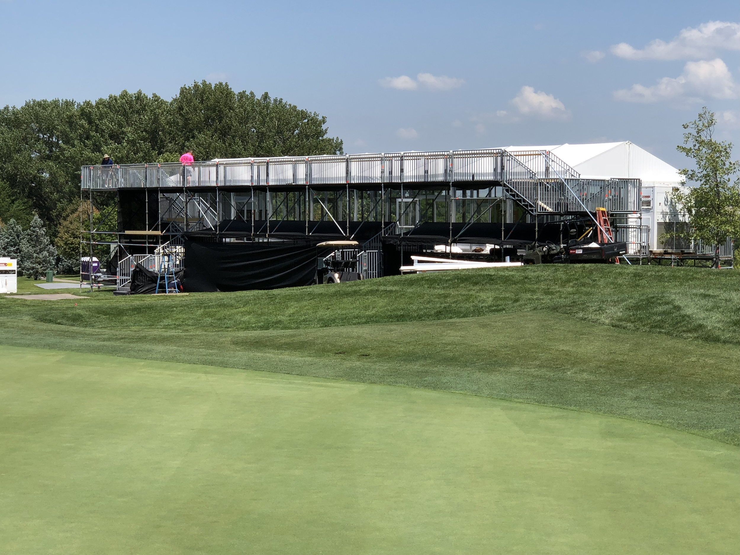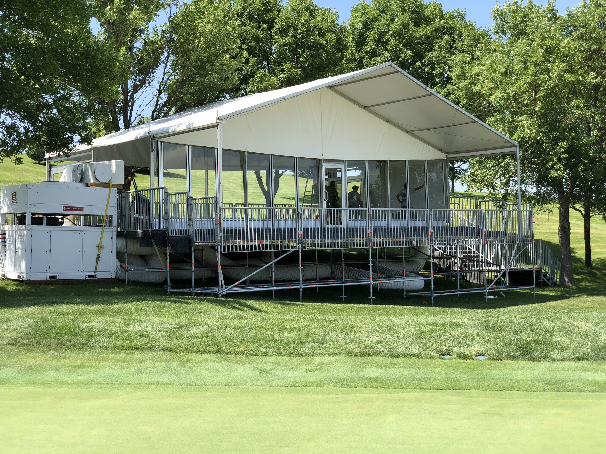 Golf courses pose a unique challenge to event production. Narrow cart paths, busy parking lots, and a job site that is still open to patrons make building structures something that requires a specific and tight schedule. We excelled at taking a very hilly and inconsistent green and turning it into a level and solid structure that complies with the International Building Code (IBC) for public access.