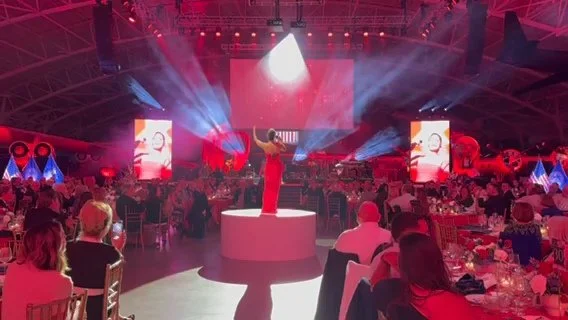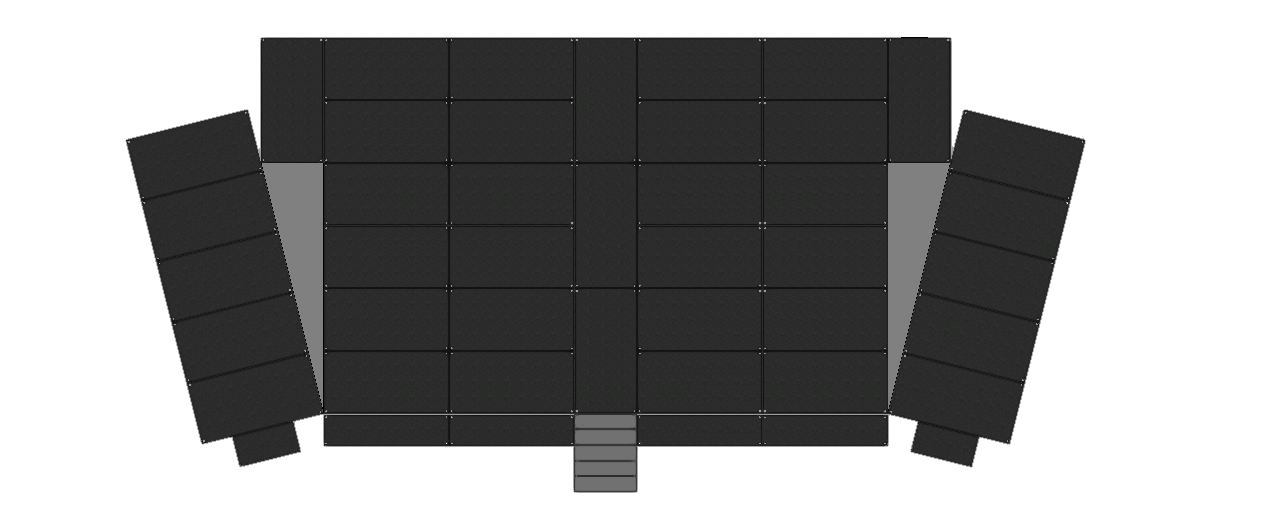 This event was a fun challenge. The stage was designed with angled wings to look closer to airplane, so custom decks were required to make the angle along with combining multiple framing systems. We also provided a circular riser for the singer to perform in the middle of the audience. We also provided custom wooden decks that were slightly shorter than the downstage edge for speakers. Finally, we provided custom stairs at the front of the stage to allow the singer access to the circular riser.